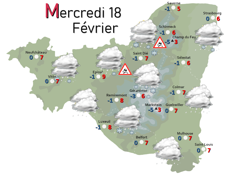 DEMAIN, les premières précipitations arrivent en tout début de matinée sur l’ouest Vosgien. Il s’agit dans un premier temps de neige jusqu’en plaine : on attend 1 à 3 cm sur Vosges et Territoire-de-Belfort, des traces en plaine du Haut-Rhin, et jusqu’à 5 cm sur les hauteurs de Neuchâteau. Rapidement, la pluie prend le relais et on se méfiera des chaussées glissantes jusqu’en milieu d’après-midi, avec localement de la pluie verglaçante. Avec le redoux qui s’installe, la limite pluie-neige remonte jusque sur les crêtes en fin de journée. On peut s’attendre avant cela à 15 cm de neige sur les sommets.