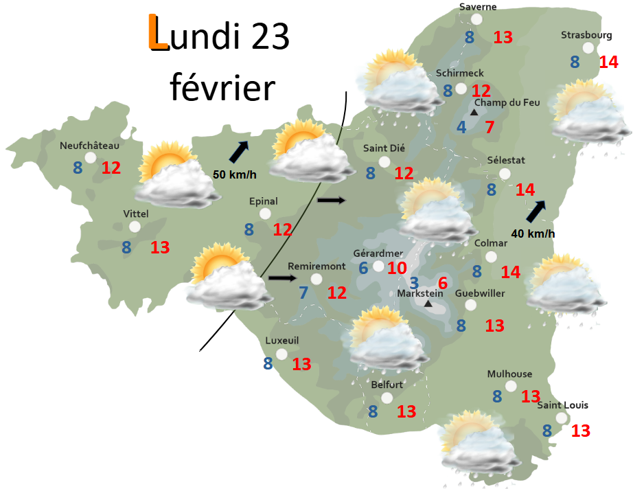 DEMAIN lundi, des pluies résiduelles touchent l’ensemble de la région en matinée. L’après-midi est favorable à une amélioration avec quelques gouttes persistantes sur le relief vosgien, mais des conditions qui s’améliorent ailleurs. Des éclaircies parfois belles reviennent notamment par l’ouest vosgien. Un vent d’ouest modéré persiste encore et permet aux températures de s’envoler avec une confortable moyenne de 12 à 14 degrés en plaine. C’est la fin d’une période de deux semaines consécutives de pluie.