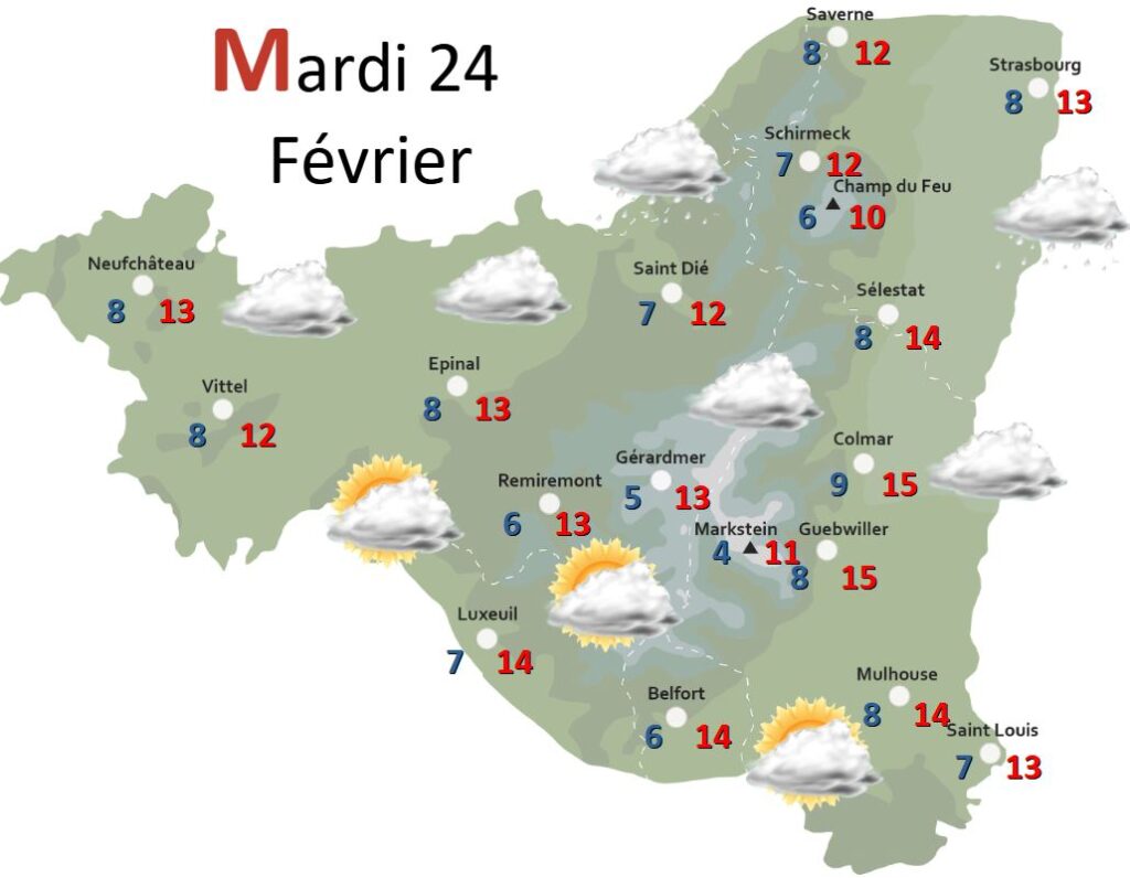 Avec un flux de sud persistant jusqu’en fin de semaine, le mercure s’annonce doux et les conditions ensoleillées, quelques fois entrecoupées de nuages d’altitude, rythmeront nos journées. Le pic de douceur aura lieu vendredi avec des maximales qui restent à affiner mais surement proche de 20 degrés en plaine et 13 à 15 degrés sur les sommets Vosgiens.