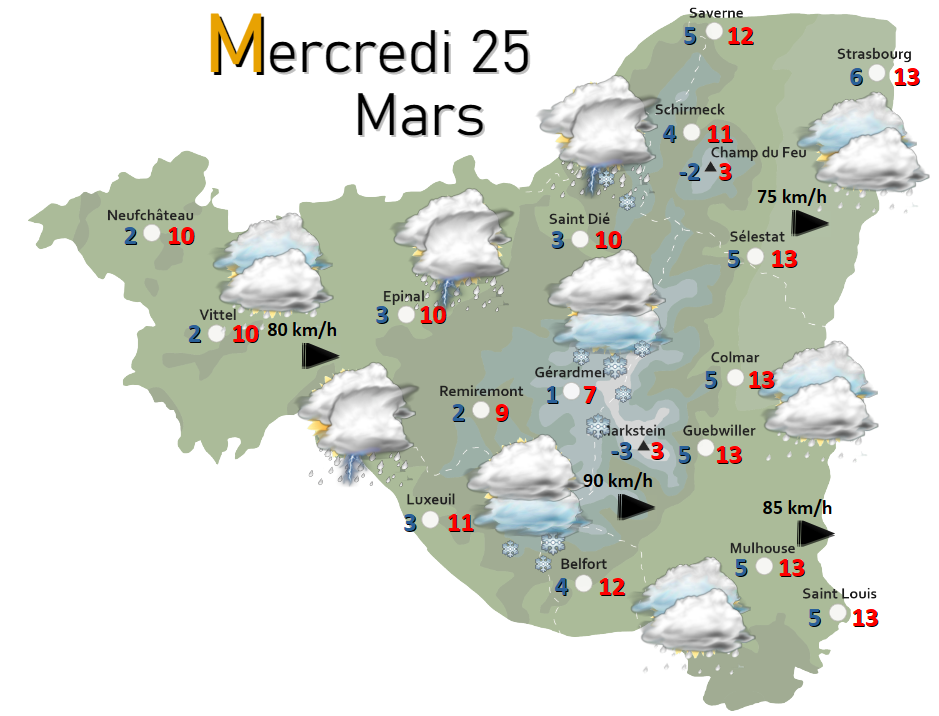 JEUDI, le flux s’orientera au nord-ouest et nous apportera pour la journée un temps particulièrement frais et humide. Il ne fera pas plus de 5 à 7°C en plaine alors que la neige tombera une grande partie de la journée sur le relief vosgien au-dessus de 400-500 mètres environ. On pourra envisager de 5 à 10 cm supplémentaires au-dessus de 600 mètres.