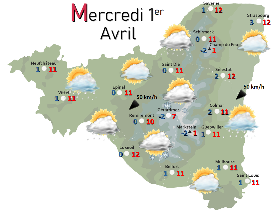 Une amélioration se dessine pour MERCREDI, avec déjà le retour d’éclaircies en matinée. Un ciel variable prend place pour l’après-midi, accompagné de quelques averses, neigeuses à partir de 800 mètres. Peu de cumuls à attendre en montagne. Sous les plus fortes averses, des rafales de nord-est à 50 km/h sont possibles.