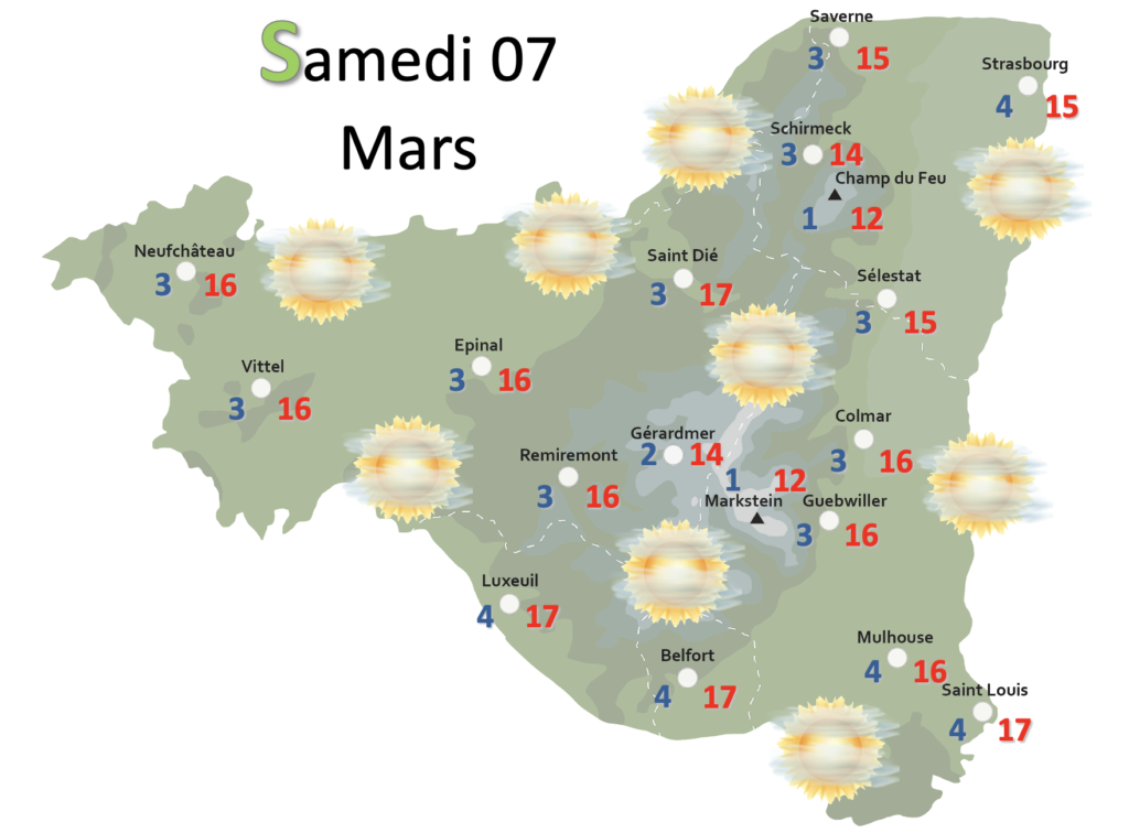 Les conditions anticycloniques se poursuivent DIMANCHE sur la région. Le soleil est présent rapidement en matinée, avec toujours un ciel laiteux, même si le soleil s’annonce un peu plus vaillant que les deux jours précédents. L’ambiance reste agréable, malgré la présence de quelques cumulus dans l’après-midi près du relief. Les températures restent très douces pour la saison.