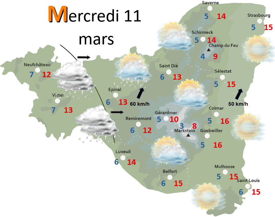 DEMAIN mercredi, la matinée est encore relativement calme avec un soleil voilé en Alsace. Plus à l’ouest, le ciel s’ennuage avec déjà quelques averses. L’après-midi voit l’arrivée d’une perturbation qui occasionne de bonnes pluies dans les Vosges. Elle se poursuit en soirée, mais la plaine d’Alsace centrale reste au sec, sous l’effet du foehn. Un vent de sud-ouest assez sensible souffle tout au long de la journée tandis que les températures maximales s’affichent en légère baisse. Toutefois, cela reste encore trop doux pour la saison.