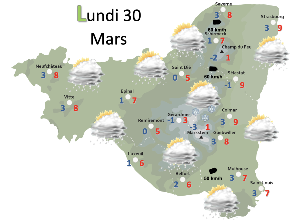 DEMAIN la perturbation traversera rapidement le territoire puisqu’en fin de matinée le ciel de traine nous concernera tous. La neige s’invitera vers 400m le matin, puis la limite remontera en fin de journée vers 700m. Des giboulées pourront toutefois être observées plus bas en altitude, tout dépend de l’intensité des averses. On pourra atteindre la dizaine de cm dès 800m en soirée. Le vent soufflera au passage du front et sous les plus grosses averses, jusqu’à 60 km/h en rafales. A noter que l’Alsace centrale sera sous l’effet de foehn et n’auront peu ou pas de précipitations. L’air restera frais avec des minimales de 0°C à 3°C en plaine, les maximales peineront à aller jusqu’à 8°C en plaine, à peine plus chaud dans la zone foehnée.