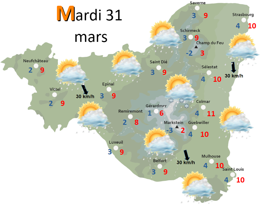 Pour MERCREDI, les conditions continuent de s’améliorer. Après la persistance de rares gouttes ou flocons en matinée, la couverture nuageuse se morcelle et les éclaircies se font de plus en plus belles dans l’après-midi. Les températures sont toujours basses pour la saison et la bise persiste.