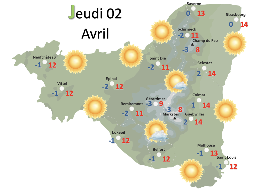 DEMAIN la journée restera sèche et très ensoleillée. Quelques nuages feront leur apparition en cours d’après-midi en montagne avec un risque faible de quelques ondées sur les Vosges du sud en fin de journée. Le réveil se fera avec des gelées quasiment partout, le soleil favorisera une très légère hausse des maximales.