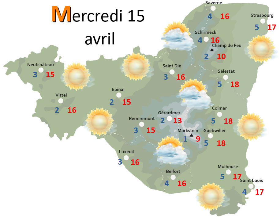 Pour JEUDI, les ingrédients sont sensiblement les mêmes que la veille. À noter que cette fois les nuages sur le relief vosgien pourraient donner une ondée dans l’après-midi. Températures stationnaires.