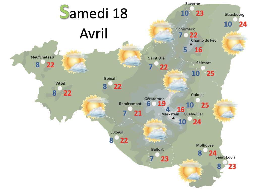 DEMAIN nous retrouverons un temps quasiment estival avec un bourgeonnement classique de cumulus en cours de journée sous un voile nuageux. Il pourra y avoir quelques gouttes très localement sur le relief. La masse d’air reste douce pour la saison avec des pointes à 24/25°C en Alsace.