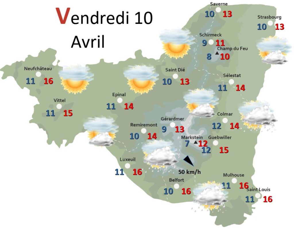 Le passage d’une perturbation cette nuit va redistribuer les cartes pour demain avec une baisse notable du mercure sur une large moitié nord du Grand-Est. En matinée, des pluies faibles concerneront encore le sud-est de la Lorraine et le sud de l’Alsace avant de rapidement s’évacuer vers l’Allemagne. Dans son sillage, elle laissera encore de nombreux nuages et limitera donc le réchauffement diurne. Un vent de secteur Nord-Ouest pourra souffler sur les crêtes Vosgiennes avec des valeurs atteignant 50 à 60 km/h.