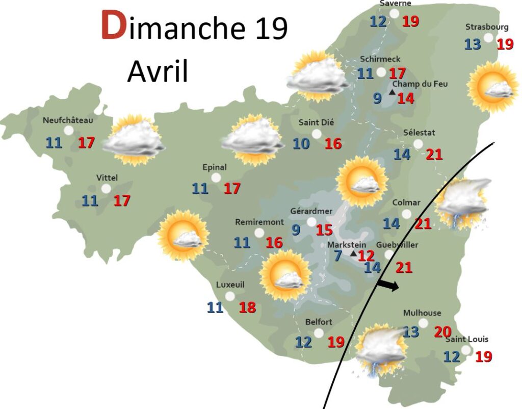 Le retour d’un temps plus sec s’amorcera dès le lundi avec un temps peu nuageux en plaine. Le massif Vosgien quant à lui pourra être concerné l’après-midi par quelques averses faibles et isolées. La majeure partie de la journée restera néanmoins sèche et nuageuse. Un vent de secteur Nord-Est bien marqué aura un impact sur les maximales qui perdront de façon homogène sur nos régions 2 à 3 degrés.