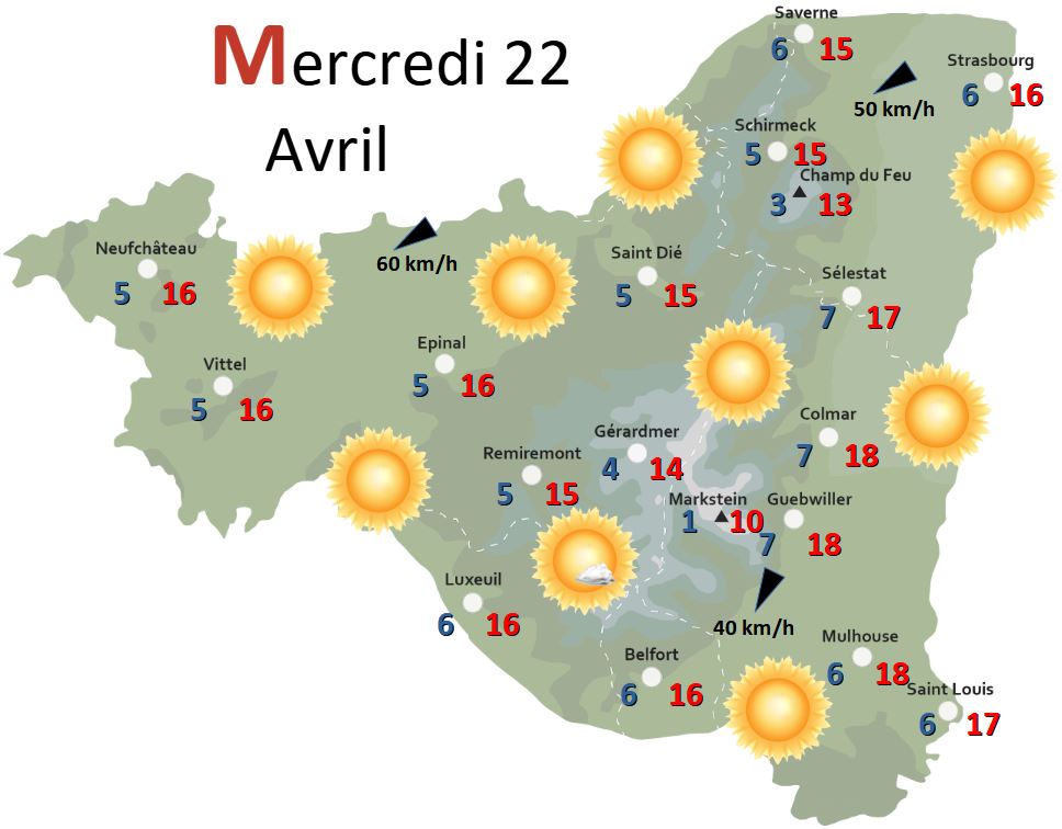La journée est sèche et le ciel lumineux surtout à mesure que l’on se dirige vers le sud-ouest de la région où le soleil est bien présent. Plus au nord et à l’est, quelques cumulus innofensifs bourgeonnent ici et là ainsi que sur le relief mais sans conséquence, la bise se renforce en fin de journée avec des rafale jusqu’à 50 km/h. Les températures sont dans les normales de saison, 3 à 4°c en plaine pour les minimales, 16 à 18°c pour les maximales. Un risque de gelée tardive est à surveiller au petit matin sur certains secteurs exposés.
